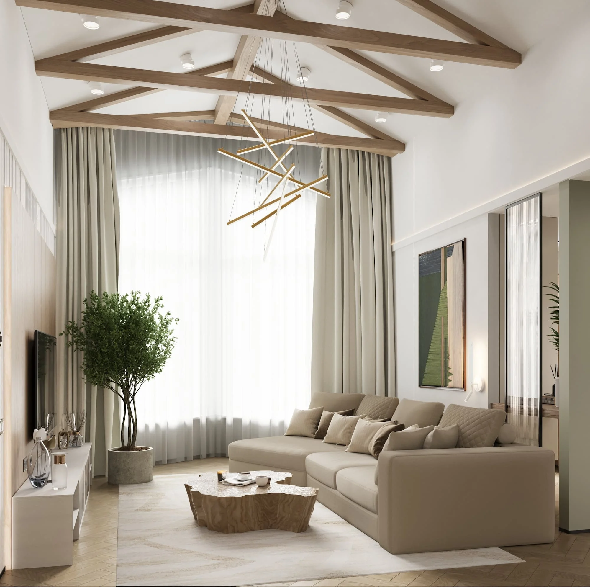 Особую атмосферу задают балки и стеновые панели, выполненные из шпона дуба, которые не только подчеркивают элегантность интерьера, но и добавляют ему тепла и уюта.