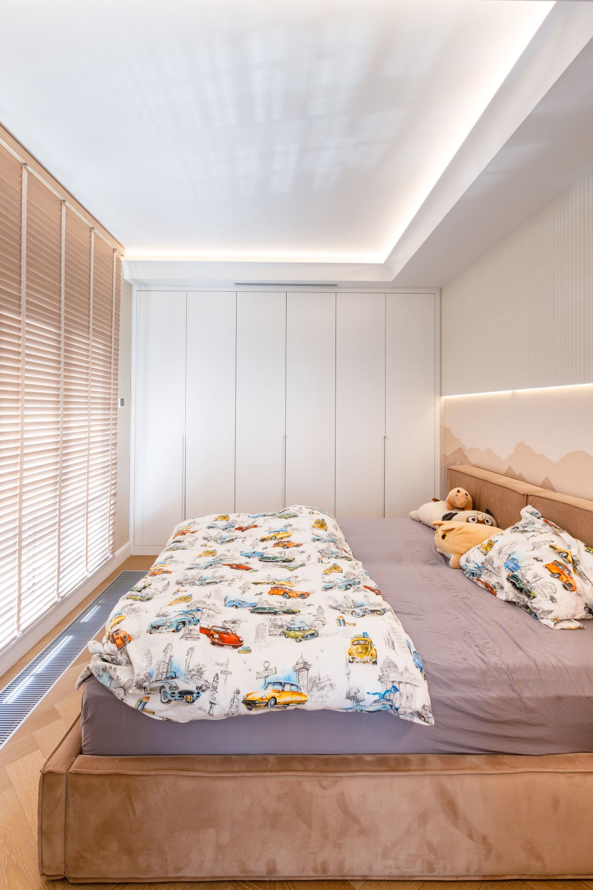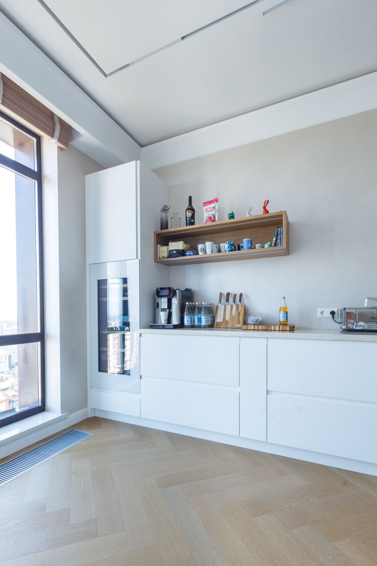 Квартира буквально светится: здесь много солнечного света благодаря окнам в пол и много локальных источников света. Это работает на создание разной атмосферы дома.
