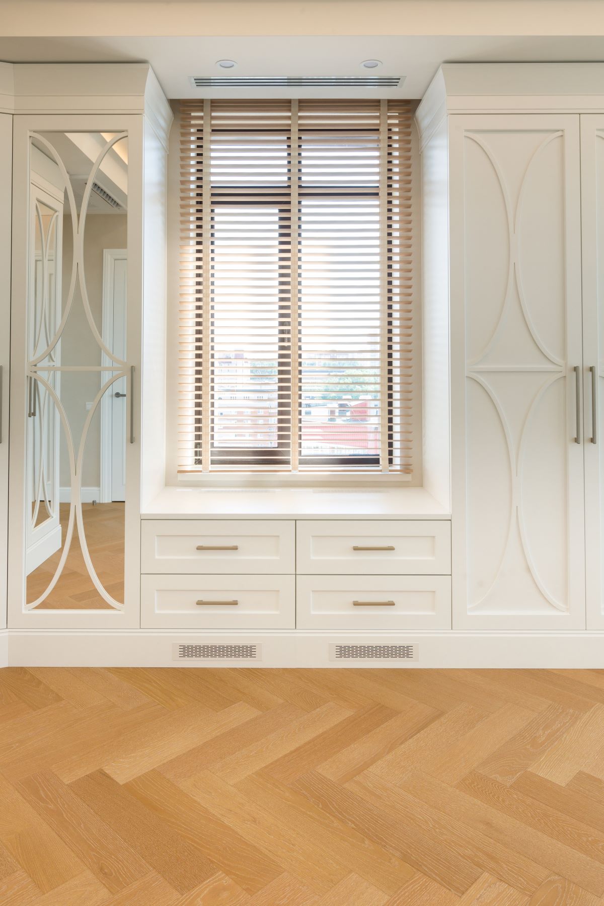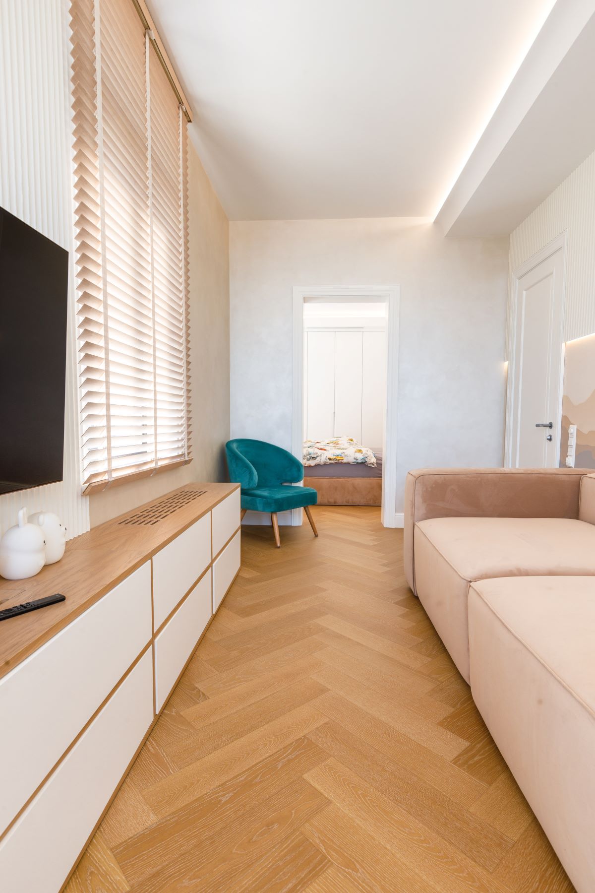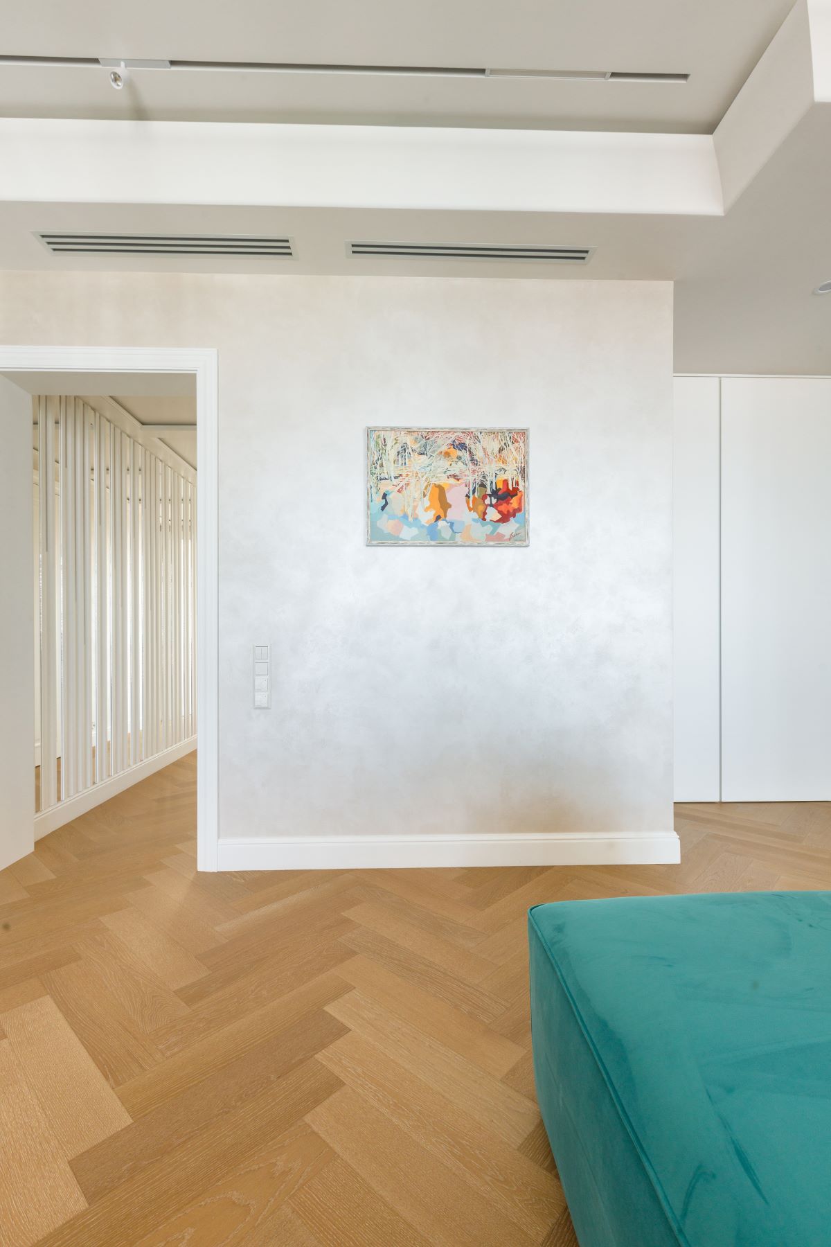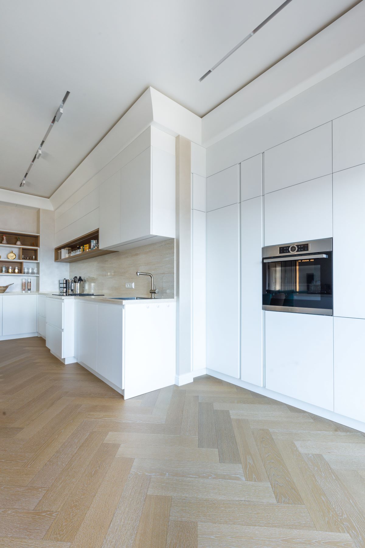 Чистота белого и геометрия линий смягчаются деревом и мягким матовым текстилем.