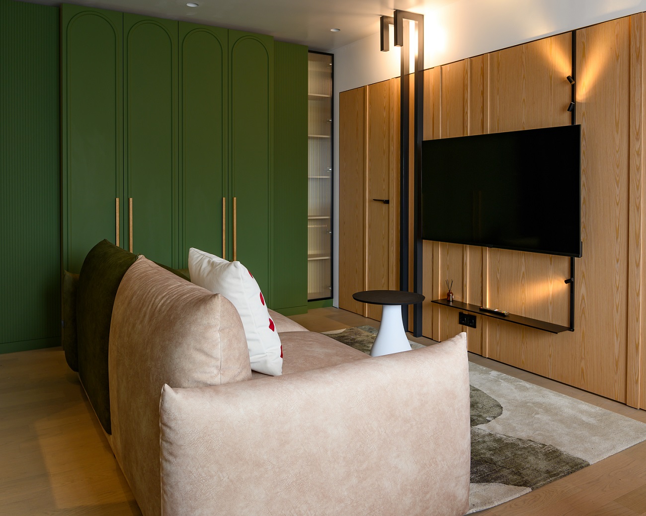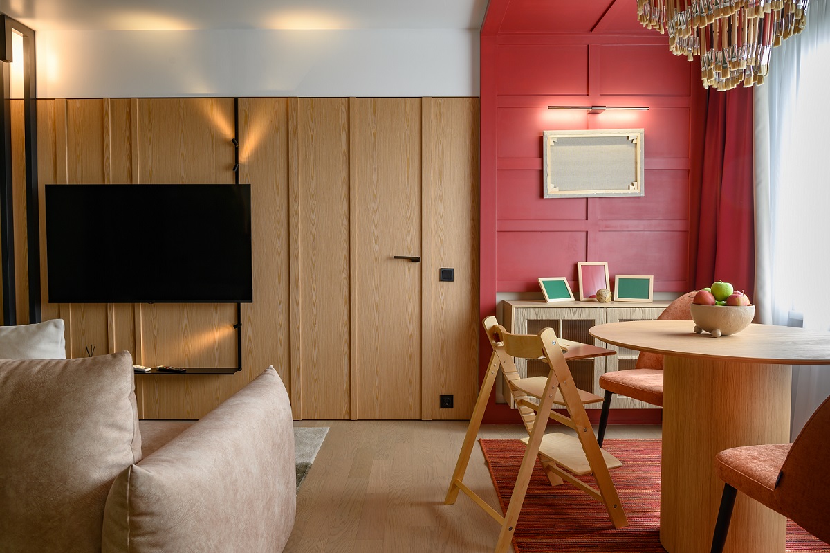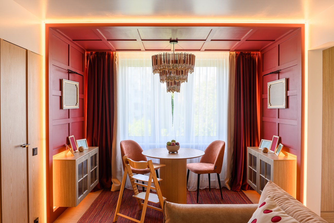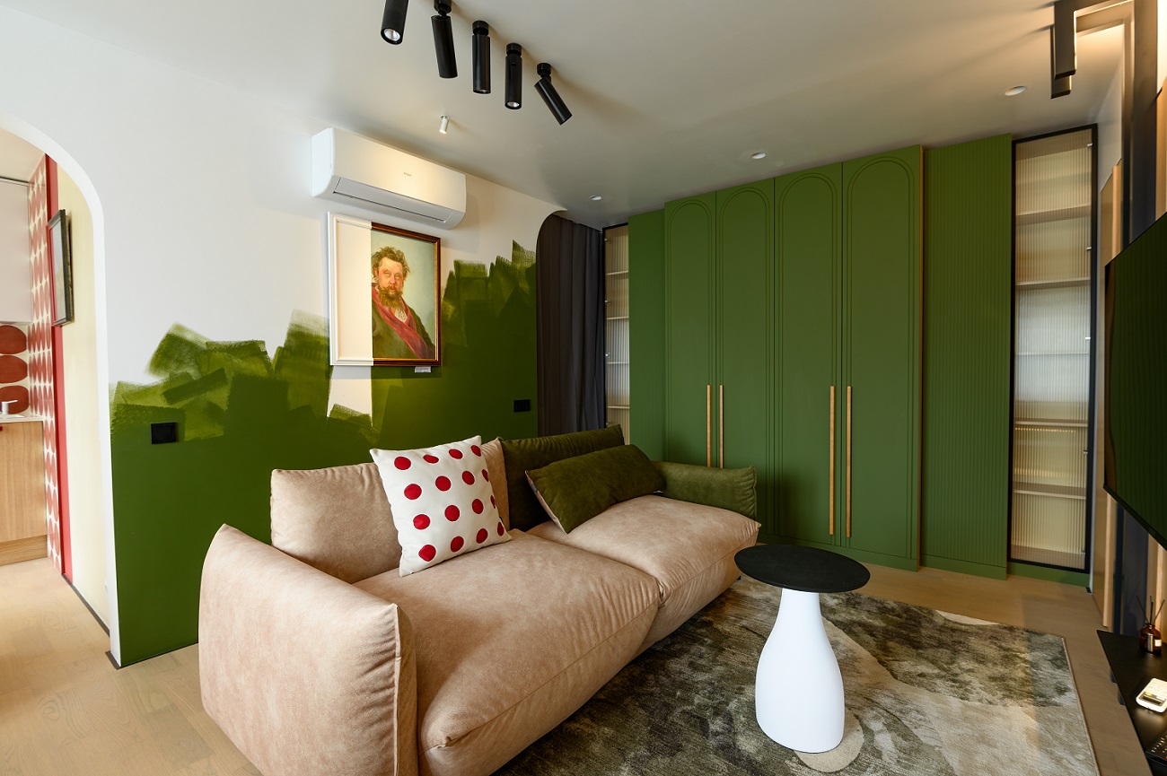 Весь интерьер получился очень гармоничным, и по цветовой гамме, и по расстановке мебели. Не обошлось и без лёгкого хулиганства дизайнера в виде частично закрашенных картин.
