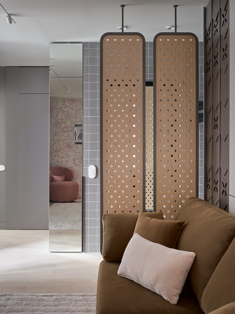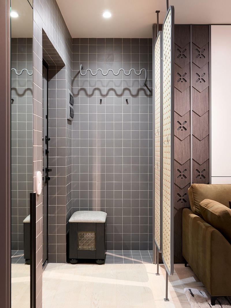 Уютная комната в новом проекте «Квартирного вопроса» объединяет несколько функций: прихожая, гостиная и спальня здесь живут вместе, но не мешают друг другу.