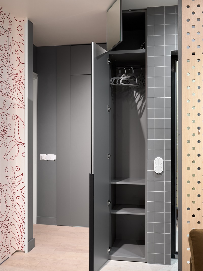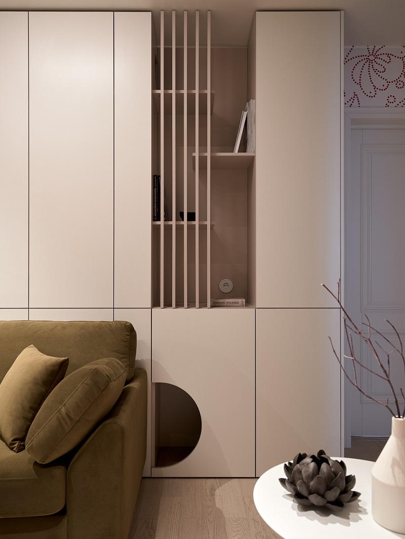Фоном для оформления стал белый цвет, создающий светлое и воздушное настроение. При этом дизайнер решила добавить в интерьер характерные элементы русского декоративно-прикладного искусства. На одной из стен появилась роспись с яркими ягодами — мотив, вдохновлённый традиционными орнаментами. Вместо привычной гжели выбрали насыщенный красный цвет, который оживил пространство, не перегружая его.